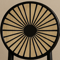 Son dossier circulaire ajouré, composé d’éléments en bois disposés en rayonnement, évoque un soleil stylisé — une interprétation élégante des motifs artisanaux marocains. Le contraste entre le bois naturel chaleureux et la structure noire mate crée une silhouette sculpturale tout en restant subtile.