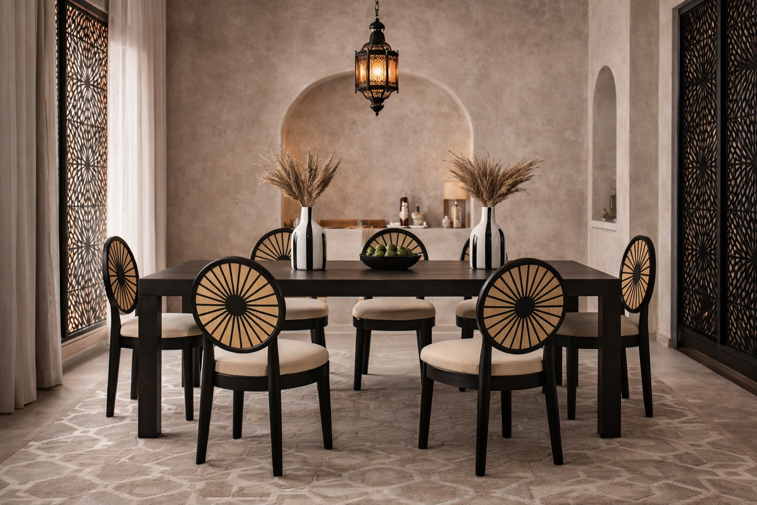 Its distinctive round backrest, crafted with radiating wooden elements, evokes a subtle sun motif — a refined echo of Moroccan artisanal geometry. The contrast between the warm natural wood and the deep matte black frame creates a sculptural presence while remaining understated.
