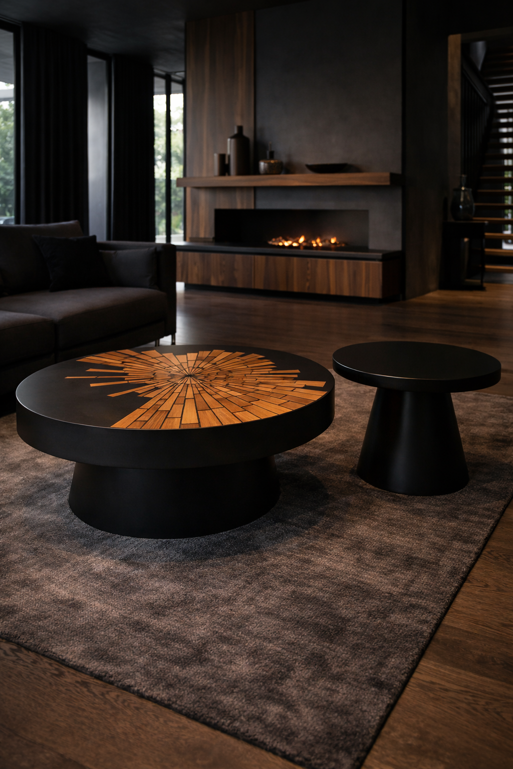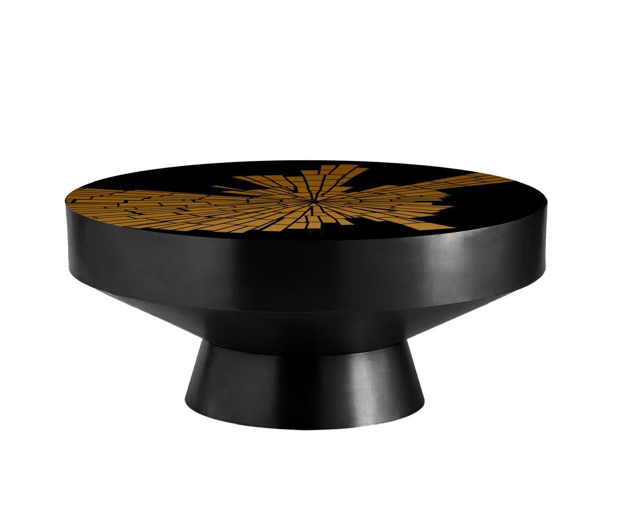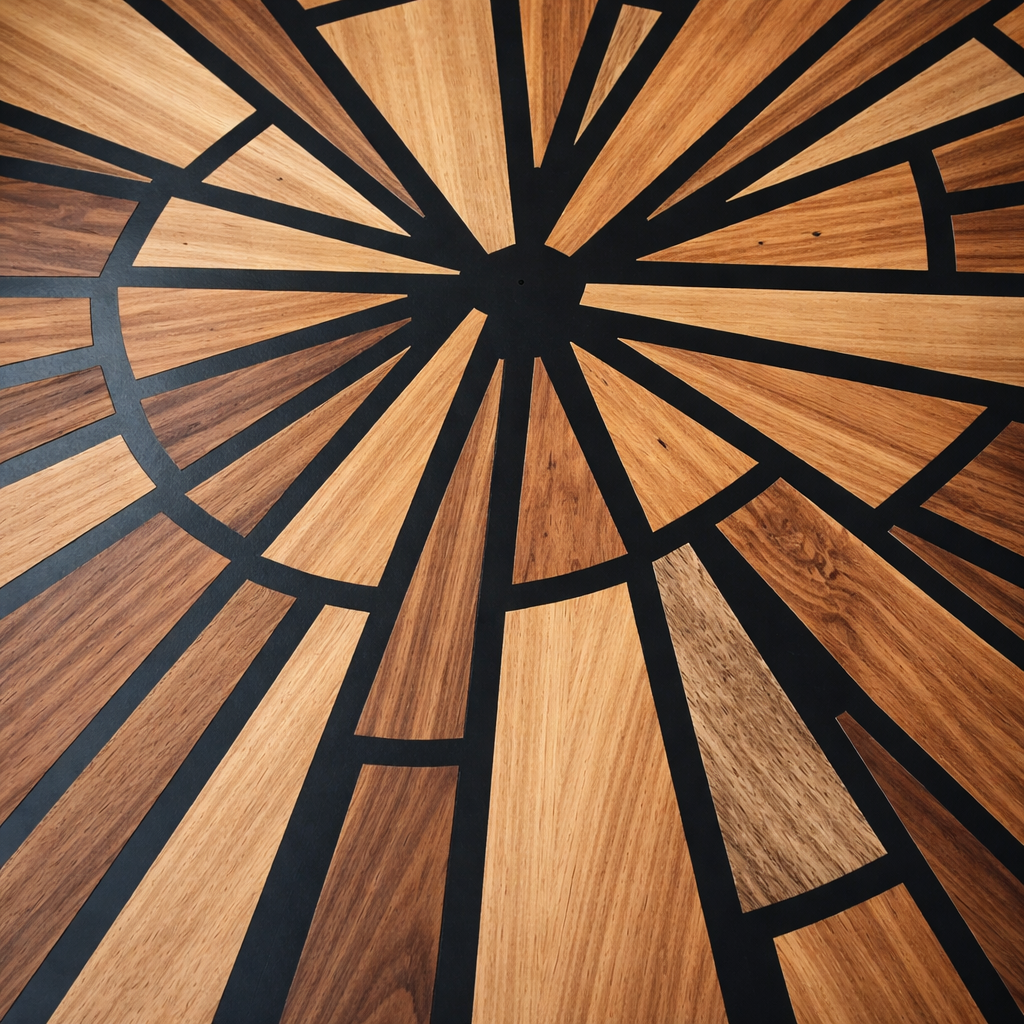 Sa signature visuelle réside dans son incrustation en bois naturel disposée en éclat solaire. Chaque pièce est minutieusement positionnée à la main afin de créer un rayonnement graphique précis, contrastant harmonieusement avec la structure noire satinée.