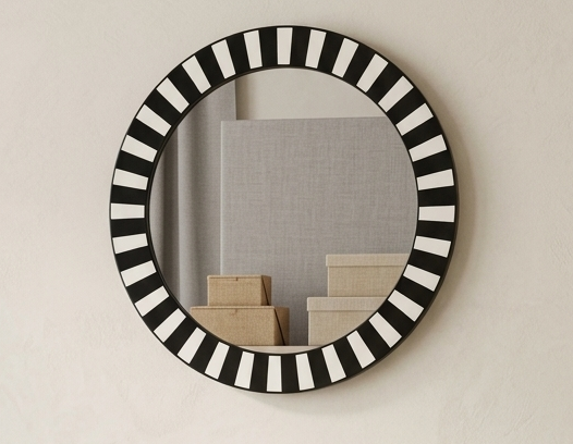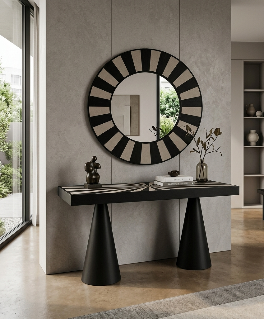 Ce miroir est conçu pour devenir le point focal d’un intérieur contemporain. Sa géométrie circulaire et son identité graphique forte lui permettent de s’imposer comme une pièce maîtresse dans un couloir minimaliste ou de structurer un salon de standing. Façonné à la main par nos artisans, le miroir Azama utilise des matériaux durables et des techniques de finition traditionnelles, garantissant que chaque pièce possède cette « touche humaine » irremplaçable. C’est la rencontre parfaite entre le design graphique moderne et l’âme artisanale ancestrale.