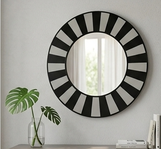 The Azama Mirror is a striking fusion of graphic modernism and Moroccan heritage. Defined by its signature black and beige solar motif, this hand-finished piece acts as a sculptural sunburst, bringing light and a bold contemporary edge to any wall it graces.